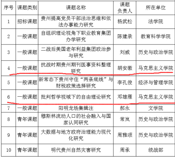 6月18日,贵州省哲学社会科学规划办公室公布《关于贵州省2015年度社科规划课题立项的通知》(黔社科规划〔2015〕11号),我校获批立项10项2015年度贵州省社科规划课题,马克思主义学院胡安徽博士、邓雄雁博士后每人获批一项。特此祝贺!