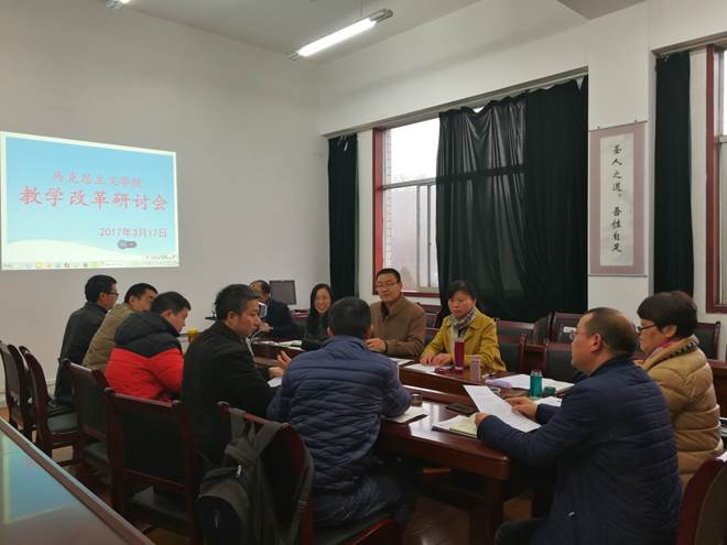 2017年3月17日下午,为贯彻落实习近平总书记在全国高校思想政治工作会议上的讲话精神、中央关于加强思想政治理论课建设的有关要求,进一步推进我校本科思想政治理论课一流课程建设的步伐,提升思想政治理论课教学质量,马克思主义学院在田家炳教育书院11楼学院会议室召开了教学改革研讨会。学院班子、各学科主任、学院办公室主任、基地办公室副主任参加了会议。会议由学院党委书记杨文武主持。
