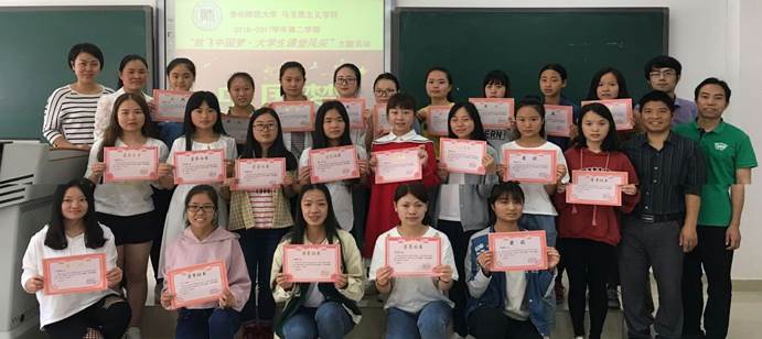 为了贯彻落实习近平总书记在全国高校思想政治工作会议上的讲话精神,积极推进高校思想政治课改革创新,促进大学生思想政治素质的培养,贵州师范大学马克思主义学院《毛泽东思想和中国特色社会主义理论体系概论》学科组推行教学试点改革创新,改进传统教学模式,以发挥学生在思政课上的自主性、积极性、主动性。2017年4月至6月,学科组陈瑞欣老师、秦琳老师、宋小红老师、孙一峰老师、程文老师等特在贵州师范大学部分教学班级举办“放飞中国梦·大学生课堂风采”主题教研活动。这次活动得到了学生们积极而广泛的参与:有的学生把自己的人生历程做了精彩的PPT;有的学生根据自己家乡特色,做了“爱家乡、爱祖国”的深情演讲;有的学生走出校外,针对社会上人们对“中国梦”的相关热点、焦点问题,进行了调查研究,还做成相应的调查研究报告或采访报道视频,并在课堂上向同学们展示,与同学们交流。